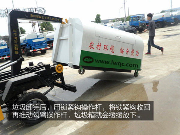 該車一車可配備多個垃圾箱(分為船形斗、方形斗),實現與多個地點的垃圾斗聯合作業。垃圾斗后蓋為可向上打開的活動門,并用4個鎖緊栓鎖緊防止在垃圾運輸過程中垃圾廂內的垃圾撒在路面上造成打開鎖緊栓可將廂內垃圾一次性自卸出來,完全液壓操作,使用方便,操作簡單。